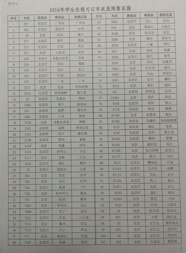 1)为优先满足长途学生需要, 2016年春运将执行各车次的限售区段,办理包含限售站在内的以远站(即限售站到终点站间)各站车票。(见下图)