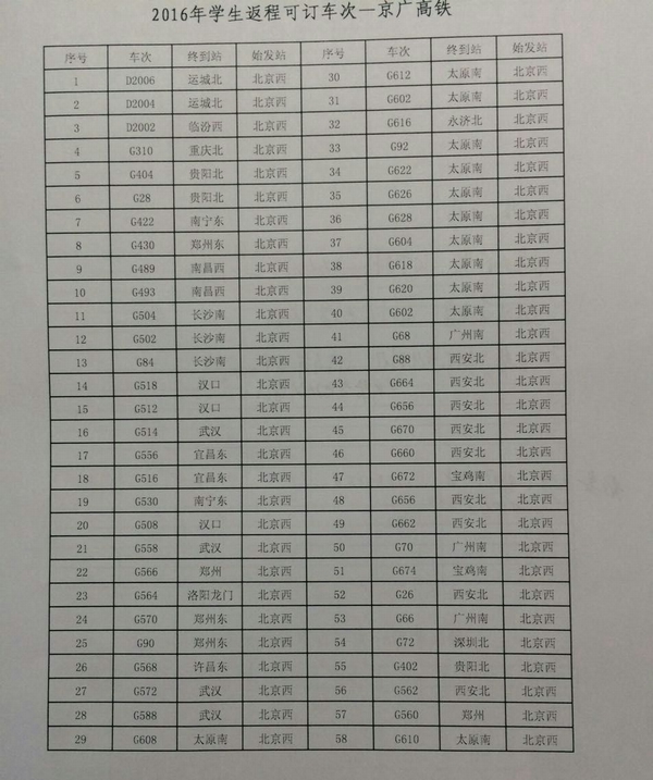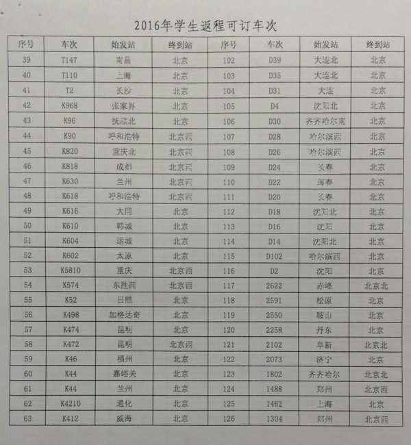 3.学生返程票乘车站为全路有直通始发能力的车站,终到站为北京、 北京西、北京南、北京北的始发车站车票,不办理中途过路站车票。
