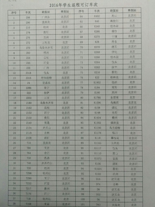3.学生返程票乘车站为全路有直通始发能力的车站,终到站为北京、 北京西、北京南、北京北的始发车站车票,不办理中途过路站车票。