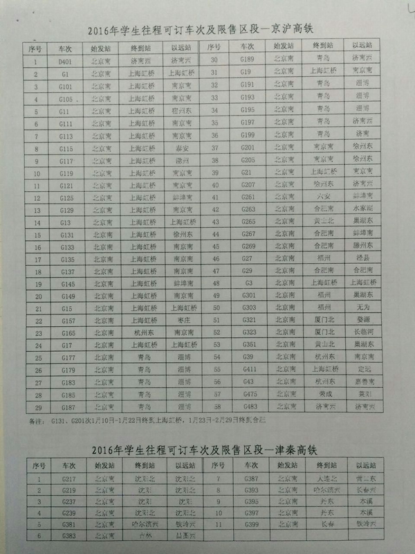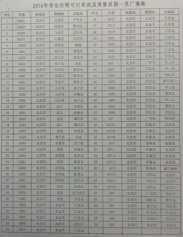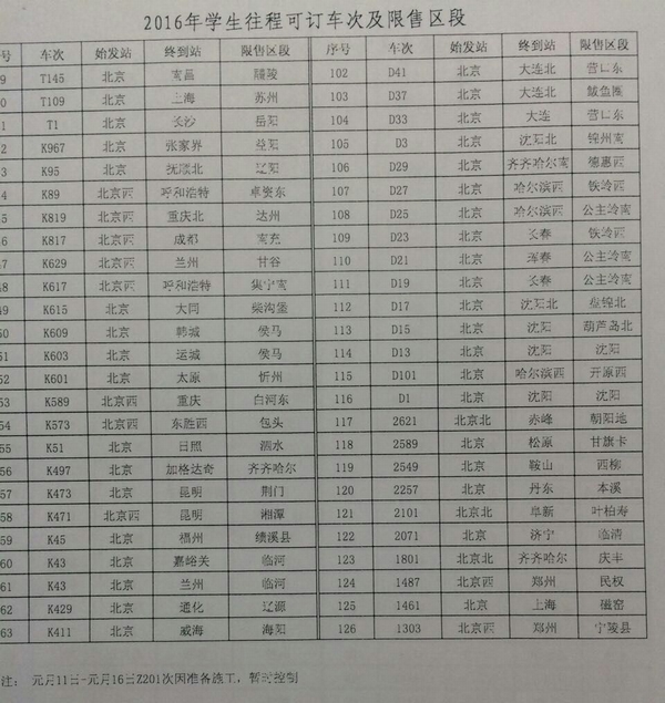 1)为优先满足长途学生需要, 2016年春运将执行各车次的限售区段,办理包含限售站在内的以远站(即限售站到终点站间)各站车票。(见下图)
